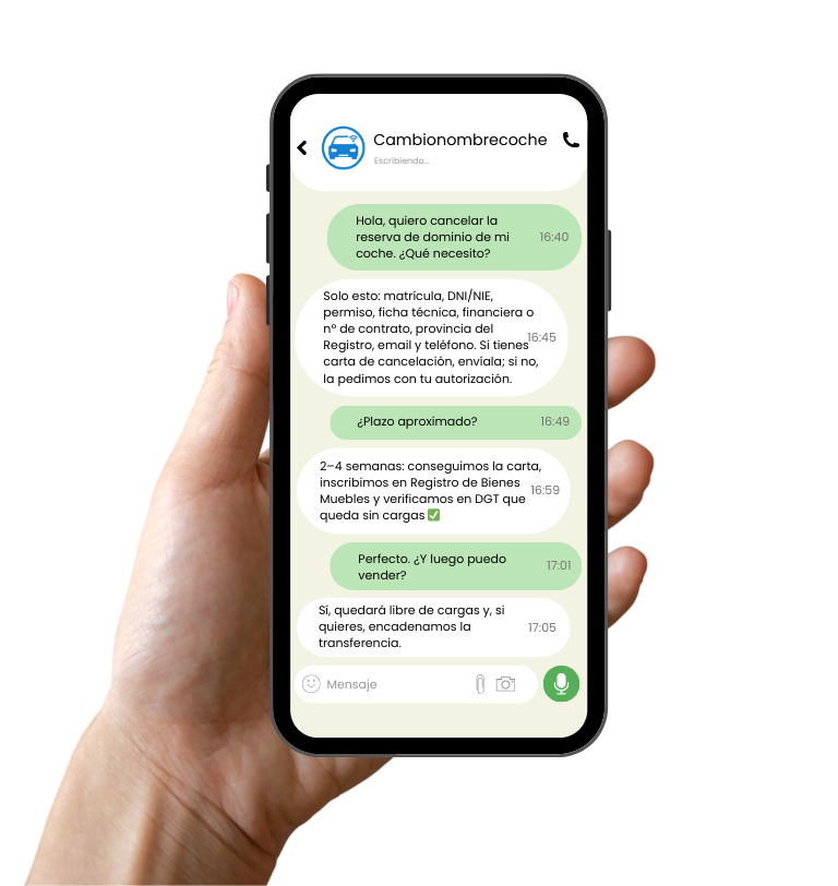 Te tramitamos la cancelación reserva dominio coche y, en cuanto figure libre de cargas, hacemos la transferencia. Si el comprador tiene prisa, coordinamos fechas para que todo cuadre.
